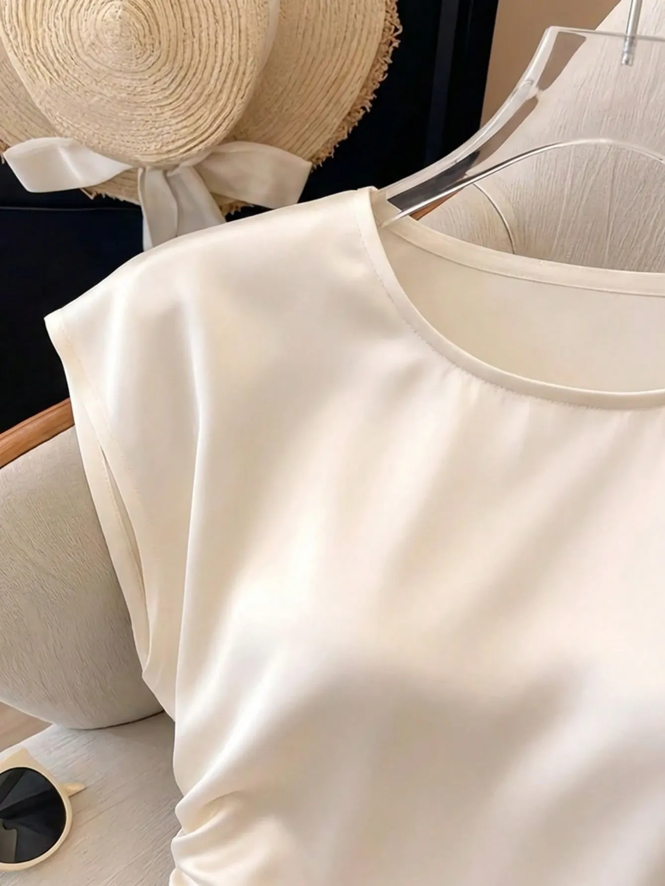 Camisa de satín manga corta cuello redondo elegante