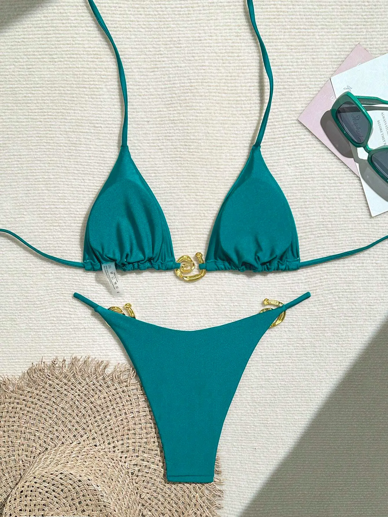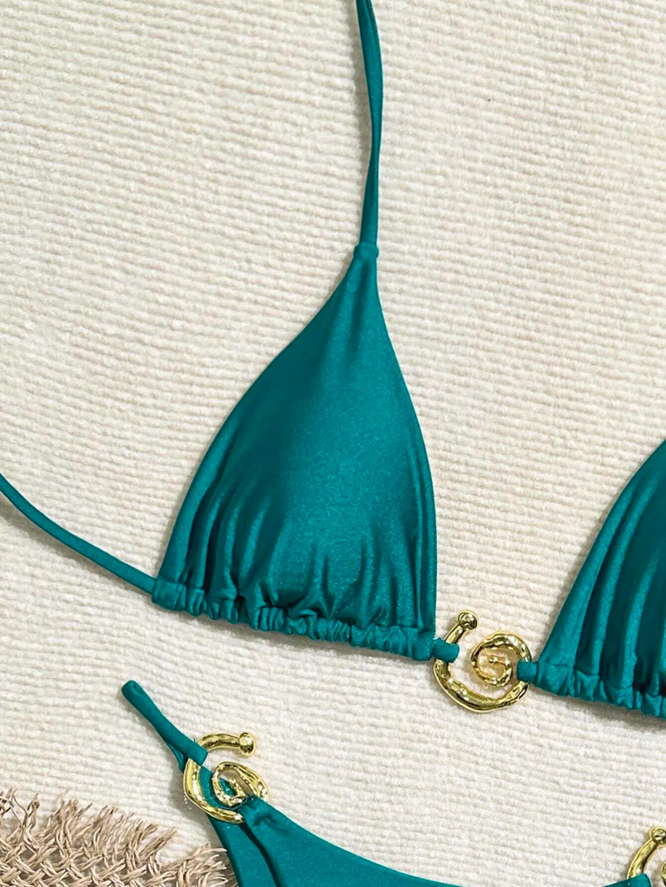Traje de baño de Bikini verde aqua con detalles de caracol dorados