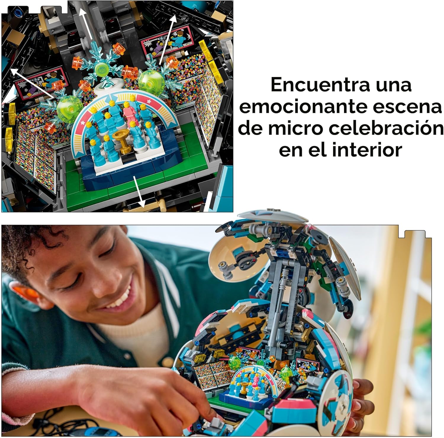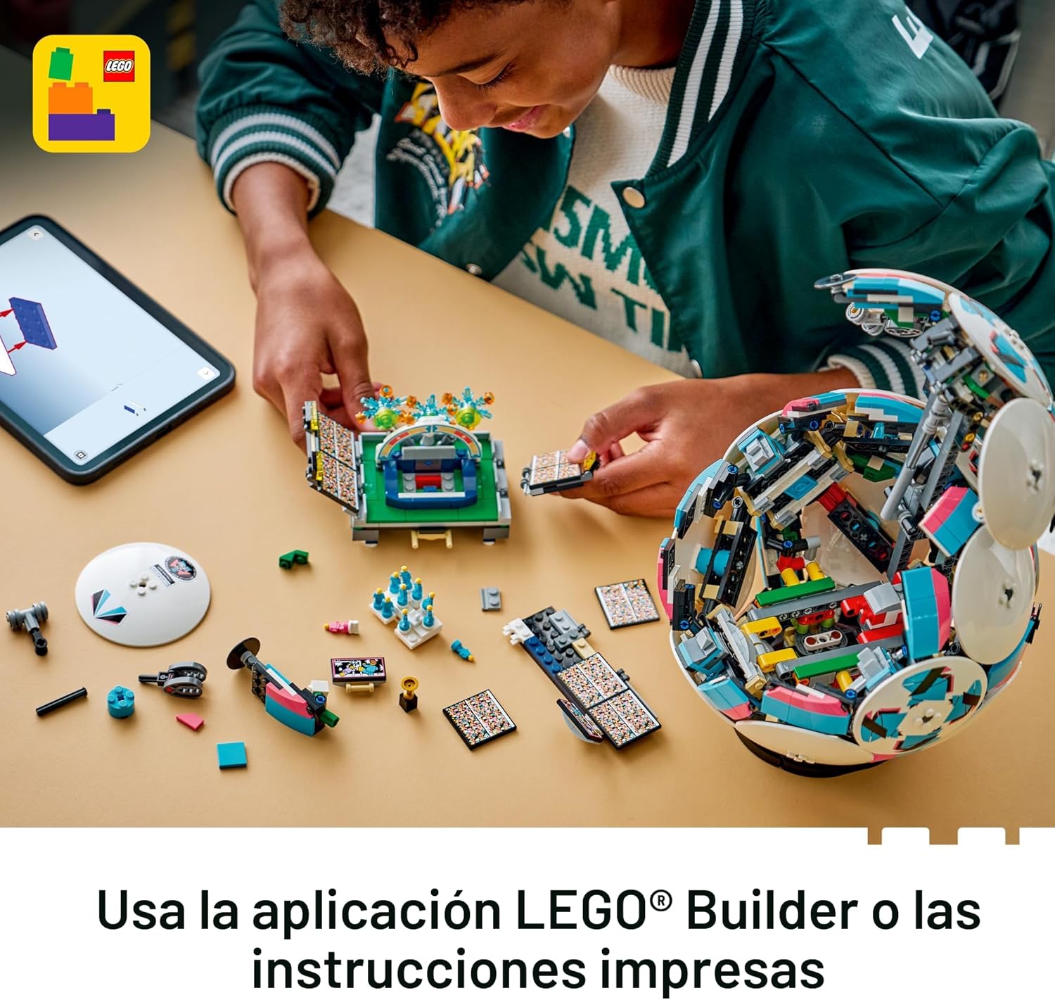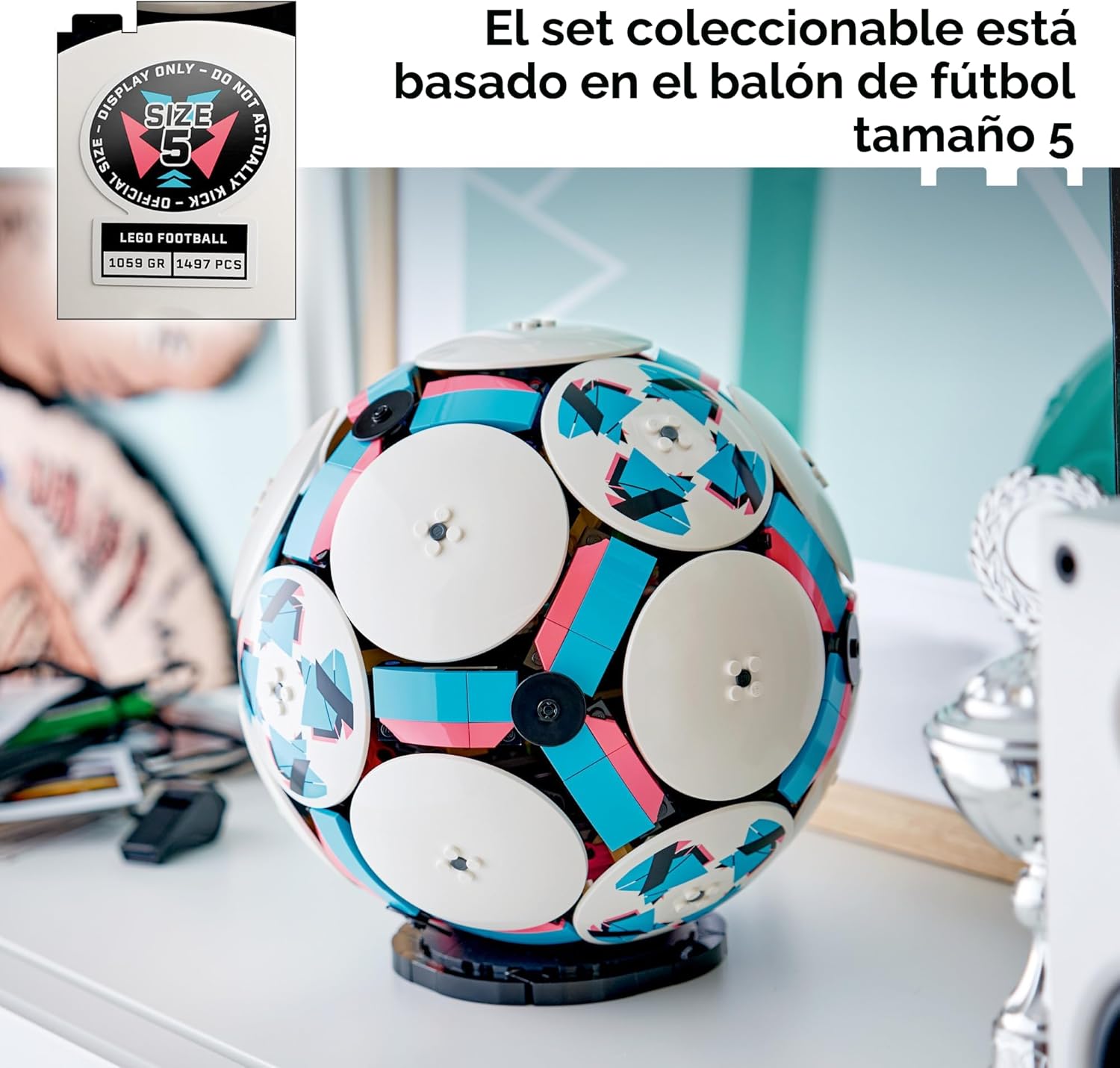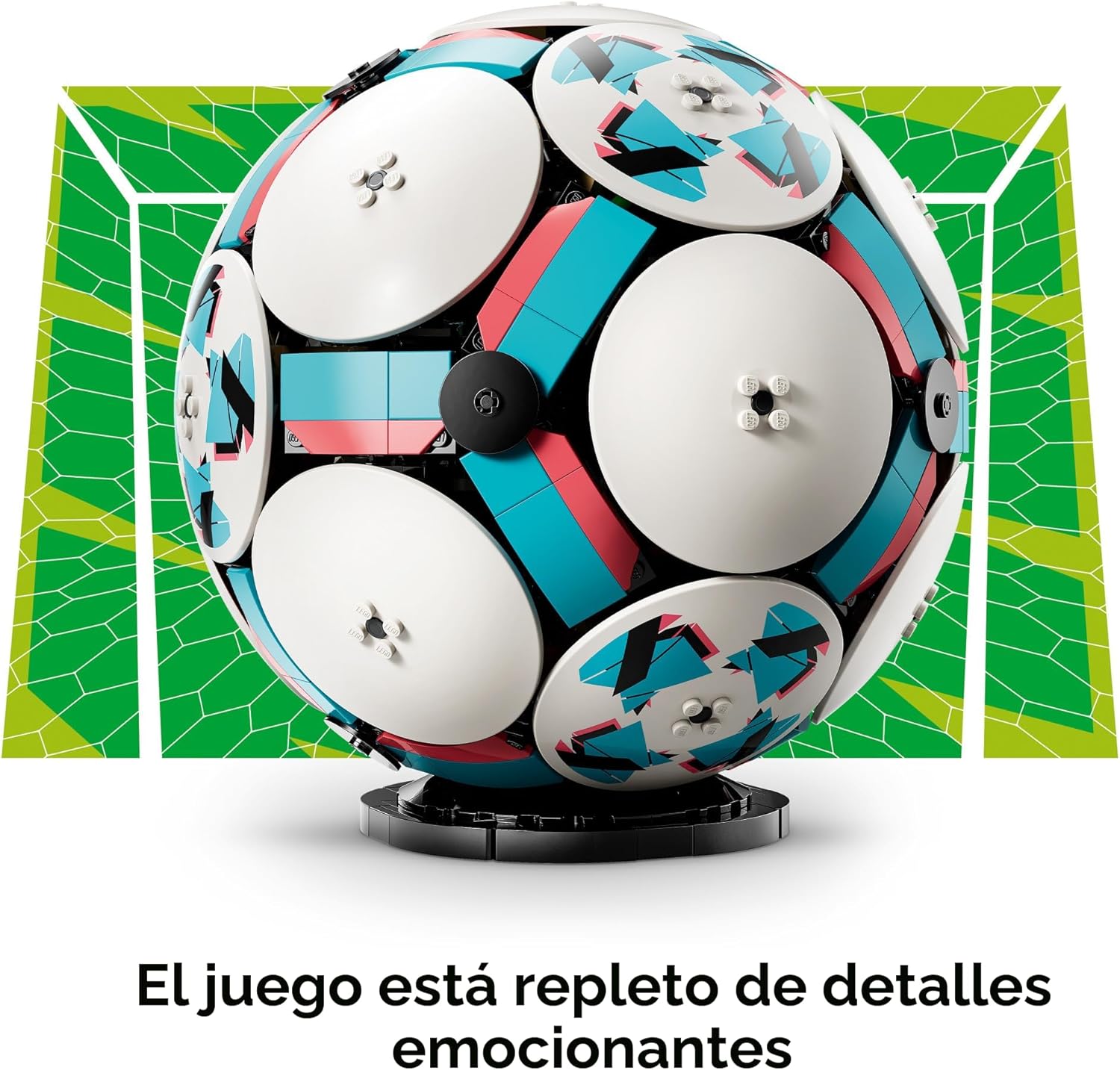 Incluye piezas de LEGO Technic que ayudan a lograr su forma redonda perfecta, además de 6 discos decorativos que le dan un acabado moderno y llamativo. Pero lo mejor está por dentro: al presionar un botón, se revela una escena sorpresa de celebración en un mini estadio, con jugadores, fuegos artificiales y hasta un pequeño trofeo dorado.