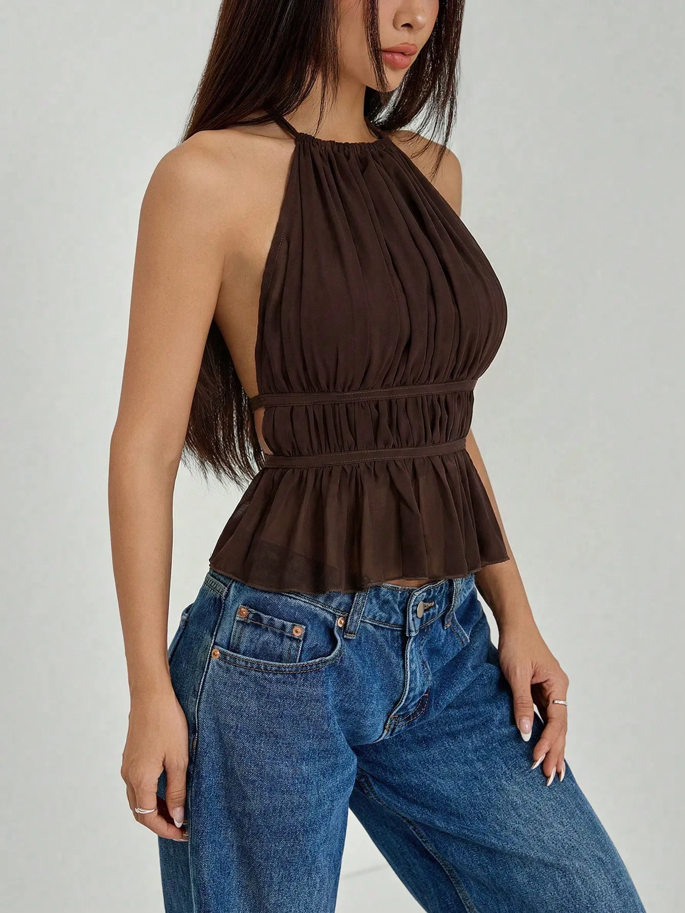 Top Café sin espalda con cuello y cintura anudada con pliegues